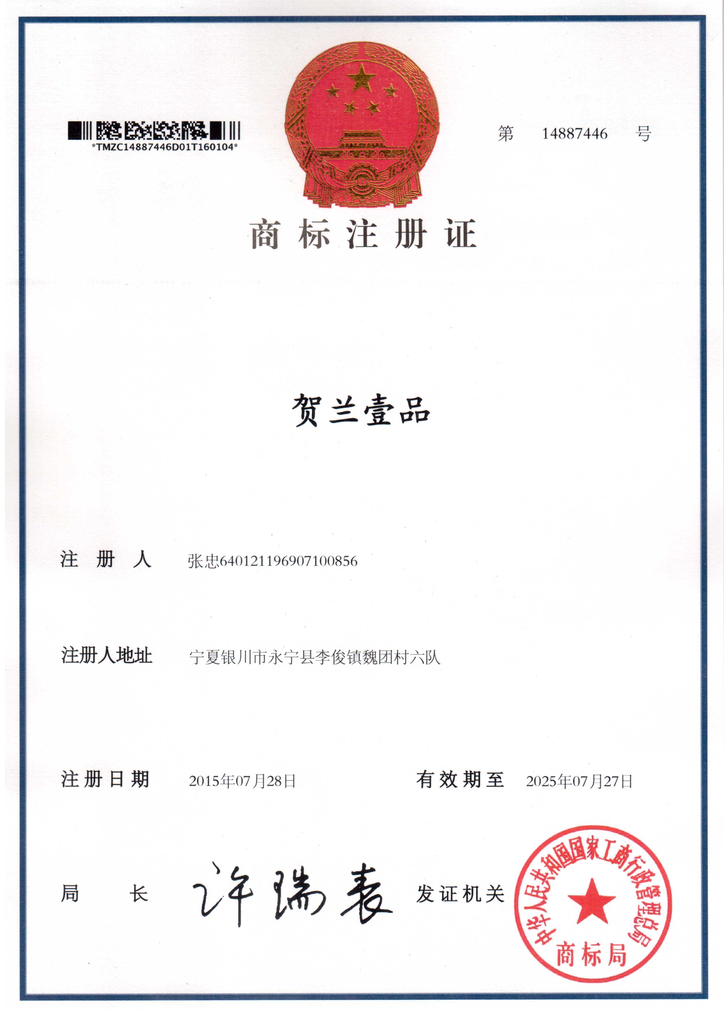 “賀蘭壹品”涼皮品牌獲商標注冊證書